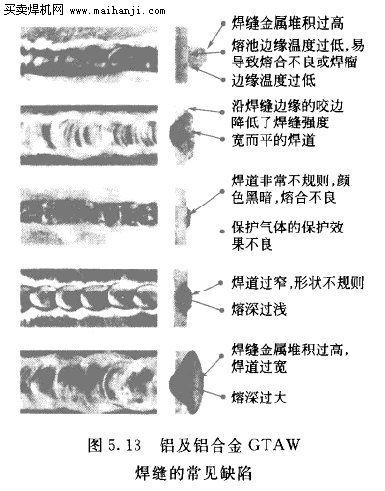 熱輸入和焊工技術(shù)對(duì)于焊縫質(zhì)量有很大的影響。圖5.13給出了鋁及鋁合金GTAW焊縫的常見缺陷。如果熱輸入太低(一般是由電流太小或焊速太快引起的),焊道高而窄,熔深淺、而且焊縫邊緣易產(chǎn)生熔合不良等缺陷。焊接速度過快時(shí),焊道窄小、熔深淺。如果熱輸入過大(一般是因電流過大或焊接速度過小引起的),焊道則寬而平,熔深過大,甚至?xí)a(chǎn)生飛濺。當(dāng)焊槍與工件直徑之間的距離太大時(shí),電弧過長,氣體保護(hù)效率降低,焊縫表面成型變差,這種情況對(duì)于鋁合金的焊接尤其明顯。