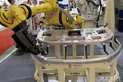抓具與工件壓緊裝置共用,兩臺(tái)機(jī)器人同時(shí)滾邊提升節(jié)拍。