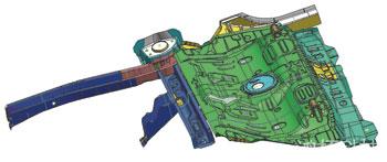 1. 認(rèn)真研究銷售市場(chǎng)所在國(guó)碰撞實(shí)驗(yàn)的標(biāo)準(zhǔn),將現(xiàn)生產(chǎn)存在的題目進(jìn)行分類,發(fā)現(xiàn)料邊不足和焊點(diǎn)不夠是影響保安件焊接強(qiáng)度的重點(diǎn)。如,中地板總成焊接時(shí)的一道工藝,對(duì)中地板總成與后地板中骨架總成焊接,中地板總成與后地板中骨架總成的梁有間隙(見圖1)。僅靠7個(gè)點(diǎn)(藍(lán)色點(diǎn))與中地板油箱左/右后固定板總成點(diǎn)定后,再與后地板備胎箱板搭接。在正面碰撞實(shí)驗(yàn)時(shí),中地板總成和后地板中骨架總成易脫焊。若將中地板總成邊沿加長(zhǎng),搭接在后地板中骨架總成的梁上并焊接,強(qiáng)度顯然要好得多。在模具修改以前,在邊沿處加4個(gè)點(diǎn)(見圖1黃色點(diǎn))。再如,前排座椅安全帶固定板在碰撞實(shí)驗(yàn)中被撕開(見圖2)。經(jīng)分析得知,原零件焊接邊少、焊點(diǎn)不足且位置欠佳,必須增加料邊和焊點(diǎn)(原焊點(diǎn)及分布:3個(gè)一排;現(xiàn)焊點(diǎn)及分布:5個(gè)兩排)。