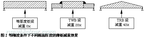 TWB和TRB 的應(yīng)用都是為了達(dá)到汽車輕量化的目的?;诠こ塘W(xué)中薄壁梁承載性能的基本理論,若由等厚度板、TWB及TRB三種板材制成的結(jié)構(gòu)件具有同樣的剛度,則其減重效果如圖2所示。