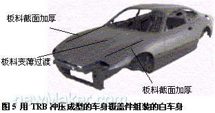 圖5為用TRB沖壓的車身覆蓋件組裝的白車身整車,注意到其前部發(fā)動(dòng)機(jī)蓋板的兩側(cè)要求有足夠好的剛性,板料厚度為1.25mm,中間部位幾乎不承受任何外力,僅需防止高速行駛中可能出現(xiàn)的顫振即可,板料厚度為0.88mm;兩側(cè)到中部為連續(xù)、光滑過渡,保證了車身的美觀和良好的空氣動(dòng)力學(xué)特性。