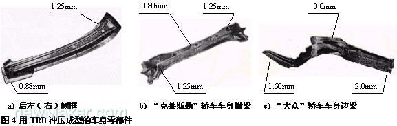 在一些汽車制造強(qiáng)國(如德國),TRB已經(jīng)開始投入汽車工業(yè)的實(shí)際應(yīng)用之中。圖4 a)所示為一個(gè)用在“奔馳”E級(jí)轎車上的TRB原型零件。這個(gè)由TRB沖壓成型的“側(cè)框”位于轎車后部,左右對(duì)稱。前端板料厚度為0.88mm,與左右側(cè)圍相接,后端板料厚度為1.15mm,恰是汽車追尾時(shí)的敏感部位,中間區(qū)域板料厚度均勻過渡。