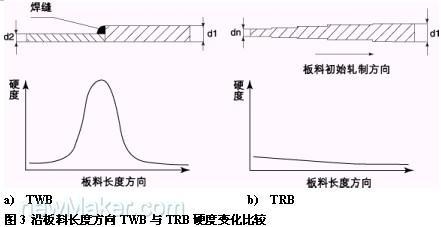 用于車身制造的變截面薄板分為兩種,一種是激光拼焊板(Tailor Welded Blanks,TWB),另一種是通過柔性軋制生產(chǎn)工藝得到的連續(xù)變截面板(Tailor Rolling Blanks,TRB)。