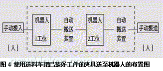 使用送料車把已裝好工件的夾具送至機器人位置的方式(如圖4),可以大大減少人的介入,實現(xiàn)節(jié)省人力的目的。由于變位機也是與自動搬運裝置配套,可以將以前由人來檢查系統(tǒng)運轉及焊接質(zhì)量的機能完全機械化,整個設備更先進、復雜。