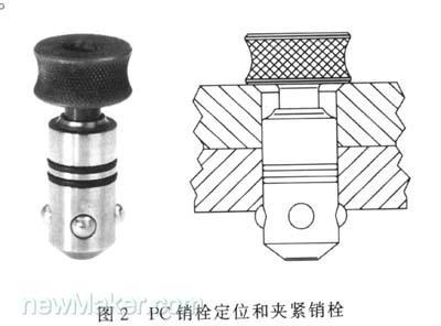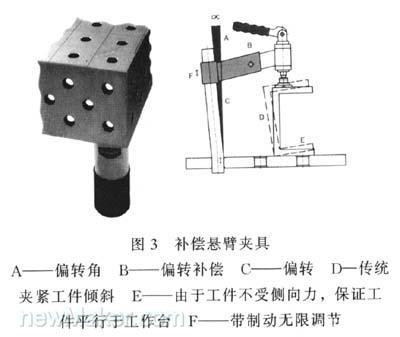 (2)補(bǔ)償懸臂夾具 由于夾具在臺(tái)面上是采用圓棒插入孔中的形式,棒孔間的間隙和夾具本身的微小柔性,使得夾具在夾緊過(guò)程中有帶動(dòng)工件偏轉(zhuǎn)的傾向。為了防止這種偏轉(zhuǎn),戴美樂(lè)公司發(fā)明了補(bǔ)償懸臂夾具的專(zhuān)利(見(jiàn)圖3)。這種夾具在懸臂中增加了彈性伸縮,化解掉夾緊時(shí)的側(cè)向分力,以補(bǔ)償夾具本身的變形和插入過(guò)程中的間隙,保證夾具的夾緊力與夾緊方向一致。
