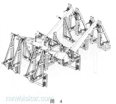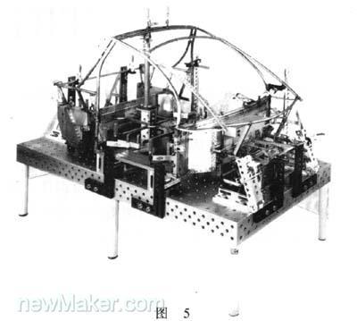 (2)應(yīng)用實(shí)例二 圖5為某著名汽車(chē)廠(chǎng)在開(kāi)發(fā)新車(chē)中使用戴美樂(lè)工裝。整個(gè)汽車(chē)的框架都用戴美樂(lè)工裝定位和夾緊。這樣做的目的,一是這種車(chē)型本身的批量不大,專(zhuān)用流水線(xiàn)焊裝不夠經(jīng)濟(jì);另一種是為大批量生產(chǎn)的焊裝生產(chǎn)尋找最佳的夾緊工藝。