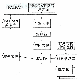 軟件系統(tǒng)由一些經(jīng)過修改的MSC/FATIGUE模塊組成,它的核心為焊點疲勞分析器SPOTW,圖1表示了這一軟件的框架。該系統(tǒng)當前只支持兩板焊點的疲勞計算。焊點應當用連接兩板中面且垂直于這兩個中面的剛性梁表達,而板用位于板中面的殼單元模擬。焊點的長度因此是板厚之和的一半。焊點附近的網(wǎng)格不需要做任何細化,對殼單元的唯一要求是它們能將正確的力傳至剛性梁。事實上,使用大尺寸的殼單元(大于2倍的熔核直徑)似乎能獲得最好的結果,即最實際的連接剛度。