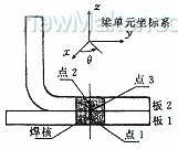 一個典型的焊點如圖2所示。陰影部分為焊核,在有限元分析中,它被模擬成一個剛性梁單元,連接兩塊板的中面。梁單元的長度為0.5(s1+s2),其中s1和s2分別為板1和板2的厚度。點3位于焊核中心線兩塊板的接觸位置,離點1的距離為0.5s1。所有的力和彎矩按圖示的梁單元坐標系取。
