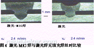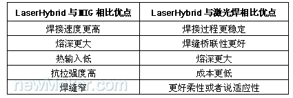 激光束焊的特點(diǎn)在于熔深大,焊接速度高,熱輸入低,焊縫窄,但焊更厚的材料需要更大激光電源。復(fù)合焊比激光焊更加經(jīng)濟(jì)。激光-MIG復(fù)合焊的焊縫是由激光和MIG焊共同形成的,降低了所需激光束的能量,從而大大降低了激光器的功率。因?yàn)榧す馄鞯男蕛H為3%,因而作用在工件上的激光束能量每降低1kW,則在激光器上降低的能耗就接近35kVA。在歐洲,每增加1kW的激光功率大約需要10萬(wàn)歐元,如果能用3kW的激光器代替4kW的激光器,投資就可以節(jié)省10萬(wàn)歐元。當(dāng)然,還要考慮到增加MIG焊電源和激光焊頭所需的費(fèi)用4萬(wàn)歐元。