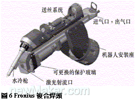 圖6所示的是Fronius復(fù)合焊頭。該焊頭幾何尺寸小,確保能夠有很好的焊接可達(dá)性,尤其是在焊接車(chē)身時(shí)。此外,焊頭具有良好的可拆卸性,便于安裝到機(jī)器人上,以及在焊接過(guò)程中焦距和焊炬具有可調(diào)功能,調(diào)整精度為0.1mm。焊接過(guò)程中的飛濺會(huì)污染激光頭的防護(hù)玻璃,為了保護(hù)激光系統(tǒng),在方形玻璃片的兩邊都噴涂了一層防反射材料。