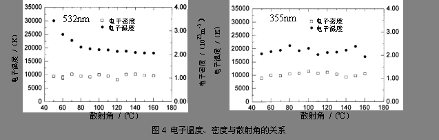 范圍內不斷減小,電子溫度明顯上升,電子密度數基本上與散射角無關;而對于波長355nm而言,電子溫度或電子密度都沒有明顯隨散射角的變化而變化。由此可見,當激光波長為532nm時,散射角度對電子溫度明顯起著決定作用;在散射角小于80o時,隨角度的減少電子溫度上升。這是因為在小散射角時,電子等離子體波的彈性碰撞率比蘭道碰撞率大。這就使得電子分布的電子等離子體波發(fā)生共振結構的展開。這一展開進而導致了電子溫度隨散射角的減小而上升。然而,波長為355nm時,對于所有的散射角,蘭道碰撞率比彈性碰撞率要大。因此,可認為在這一波長時電子分布的彈性碰撞是可忽略的;電子溫度值與散射角無關。Snyder等人在實驗中也證實了這一現象。同時,通過比較小散射角時分別對應波長532nm和355nm的測量數據,可以得出電子分布的彈性碰撞效應的定量值。