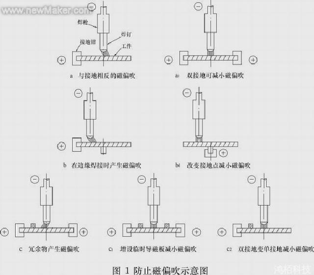 由于鋼結(jié)構(gòu)的不對(duì)稱性和接地鉗固定點(diǎn)不合理等諸多因素,造成螺柱焊接處附近的磁場(chǎng)分布不均勻,使電弧四周受到的電磁力不平衡,因而產(chǎn)生電弧的磁偏吹現(xiàn)象,致使螺柱四周的焊縫不對(duì)稱,這在大直徑螺柱焊或穿透焊時(shí),由于提升高度較大,因而更容易出現(xiàn)。焊后檢查如發(fā)現(xiàn)焊縫四周不均勻,或某邊根本沒有焊肉,或某邊焊縫有大量氣孔,則應(yīng)懷疑是磁偏吹造成的,解決的辦法有: