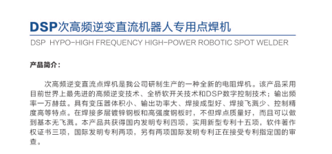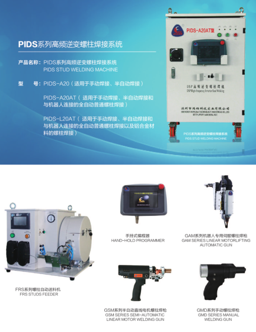 深圳市鴻栢科技實(shí)業(yè)有限公司是一家專業(yè)從事螺柱焊機(jī)、次高頻點(diǎn)焊機(jī)研發(fā)和生產(chǎn)的國(guó)家級(jí)高新技術(shù)企業(yè)。本公司是國(guó)家重點(diǎn)科技攻關(guān)項(xiàng)目和國(guó)家級(jí)火炬計(jì)劃項(xiàng)目承擔(dān)者、國(guó)家創(chuàng)新基金資助單位、深圳市政府重點(diǎn)扶植企業(yè),國(guó)家十二五重大專項(xiàng)“基于機(jī)器人的汽車焊接自動(dòng)化生產(chǎn)線”項(xiàng)目中,機(jī)器人電動(dòng)伺服點(diǎn)焊機(jī)的承擔(dān)者。公司的主要產(chǎn)品有:轎車車身螺柱焊接自動(dòng)化成套設(shè)備、種類齊全的普通螺柱焊機(jī)和機(jī)器人螺柱焊機(jī)、次高頻逆變懸掛直流點(diǎn)焊機(jī)和立式點(diǎn)焊機(jī)、機(jī)器人用次高頻逆變直流點(diǎn)焊機(jī)等。另外本公司還承接各種點(diǎn)焊、螺柱焊和弧焊等自動(dòng)化焊接平臺(tái)業(yè)務(wù)。
